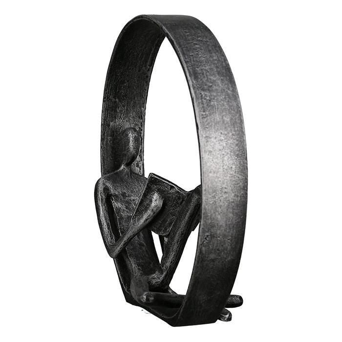 Design-Skulptur "Novel" Eisen . silberfarben . Antikfinish Mann mit Buch in Ring mit Spruchanhänger