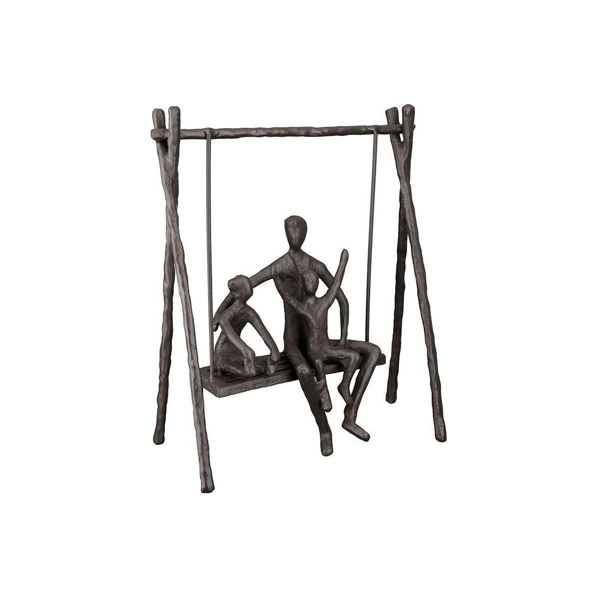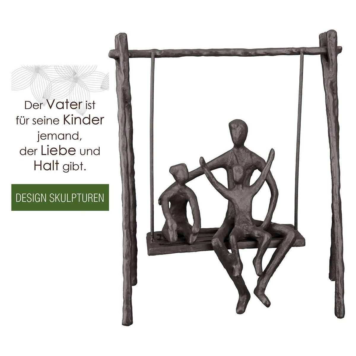 Die hochwertige Design Skulptur "Vaterliebe" ist aus Eisen gefertigt und brüniert. Es stellt einen Vater mit Sohn und Tochter auf einer Schaukel dar. Durch die Oberflächenstruktur bekommt die Figur das gewisse Etwas. Die Familie ist eine wunderbare Deko, die Ihrem Wohnambiente Eleganz verleihen wird. An der Skulptur ist eine poetische Botschaft für den Empfänger sowie ein Zertifikat angebracht.
