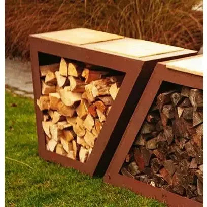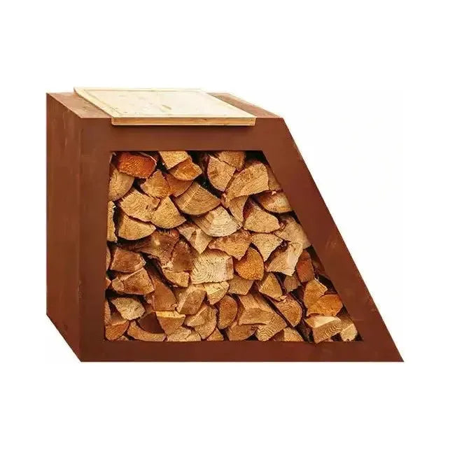 Auch als Raumteiler auf der Terrasse oder im Garten ist das Kaminholzregal gut einsetzbar und bietet Dank dem Schneidebrett aus Bambus zugleich noch eine Abstellfläche für Gartenfeiern.