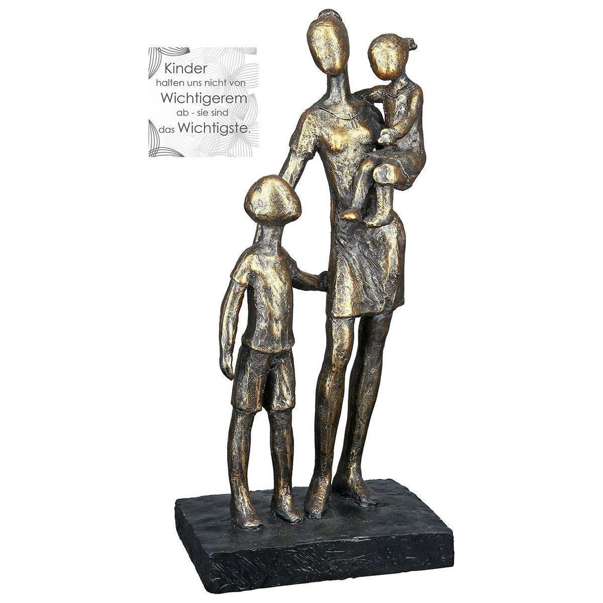 Lautes Kinderlachen und eine verschmierte Schokoladenschnute. Eine unbeschwerte Zeit für Kinder und Eltern, die leider viel zu schnell vergeht. Die Poly Skulptur "Mutter mit Kindern" im Büro auf dem Sideboard oder in den eigenen vier Wänden dekoriert erinnert an das unvergleichliche Gefühl „Mama zu sein“ und daran, achtsamer die Zeit zu genießen! Die hochwertige Skulptur ist aus Poly gefertigt. Die Bronzeoptik der Skulptur erinnert an brüniertes Messing. An der Skulptur ist eine poetische Botschaft für den Empfänger sowie ein Zertifikat angebracht. Verschenken Sie eine Aufmerksamkeit mit Symbolcharakter und ‚Tiefgang‘.
