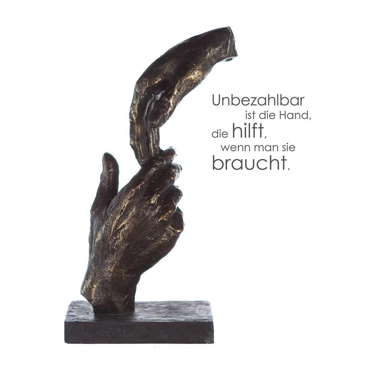 "Unbezahlbar ist die Hand, die hilft, wenn man sie braucht." Mit diesem Spruchanhänger ist die Skulptur "Two Hands" versehen. Sie ist aus dem Kunstharz Polyresin hergestellt und somit äußerst widerstandsfähig. Die bronzefarbenen Hände erhälten auf der grauen Basis einen festen Stand. Sie wird durch ihre Oberflächenstruktur zum einzigartigen Blickfang. Diese Skulptur ist eine Dekoration mit Symbolcharakter und ‚Tiefgang‘.