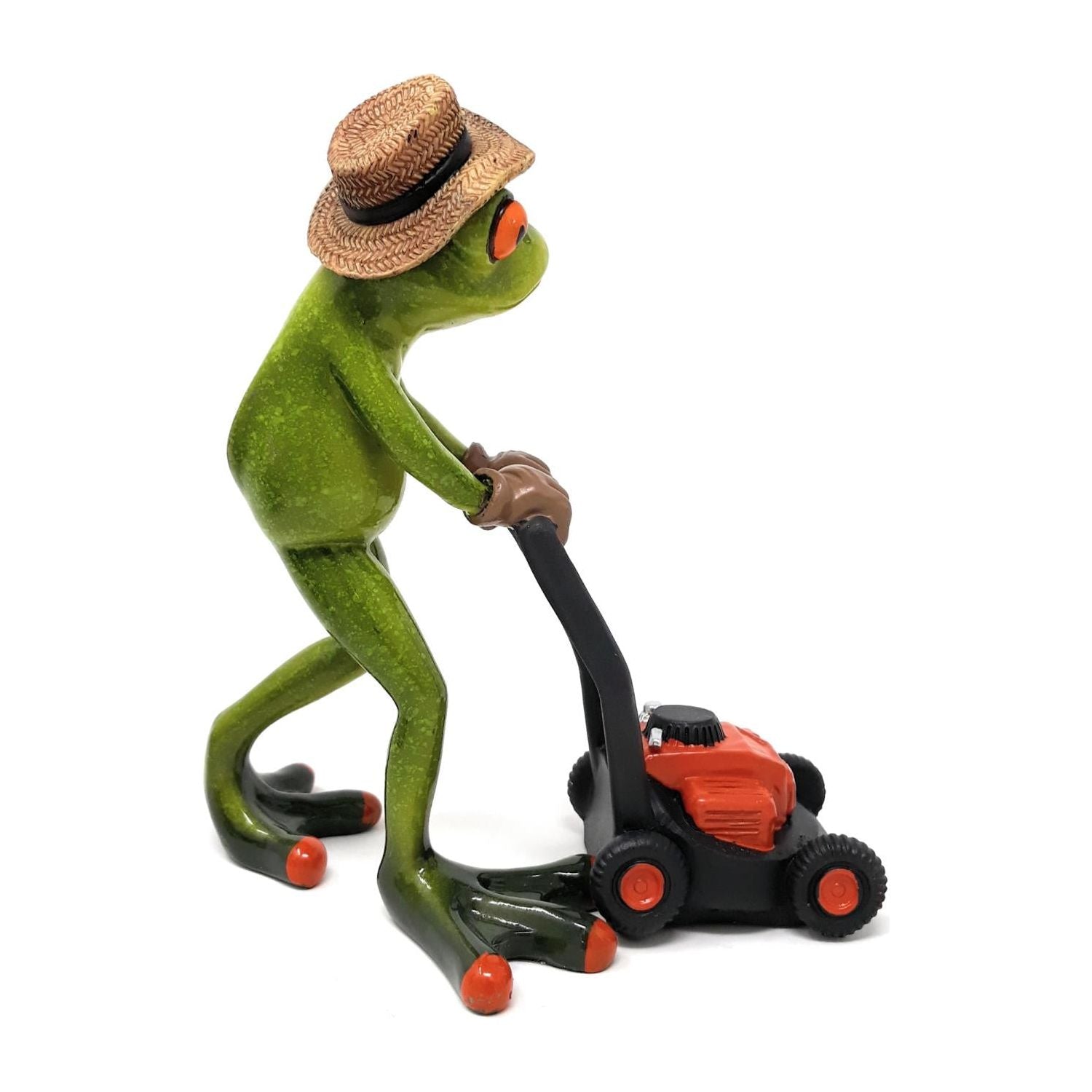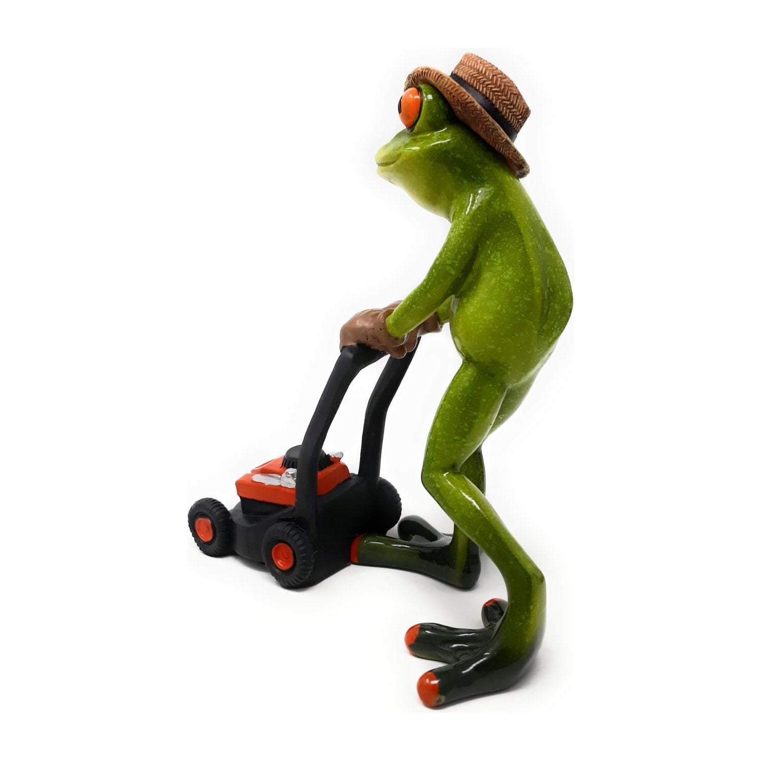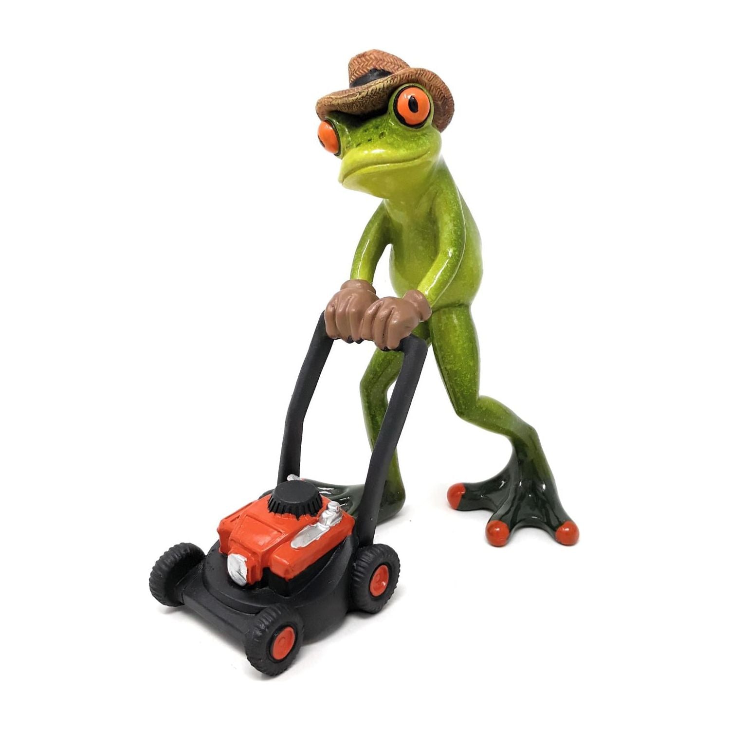 Dekofigur Gärtner Frosch mit Rasenmäher