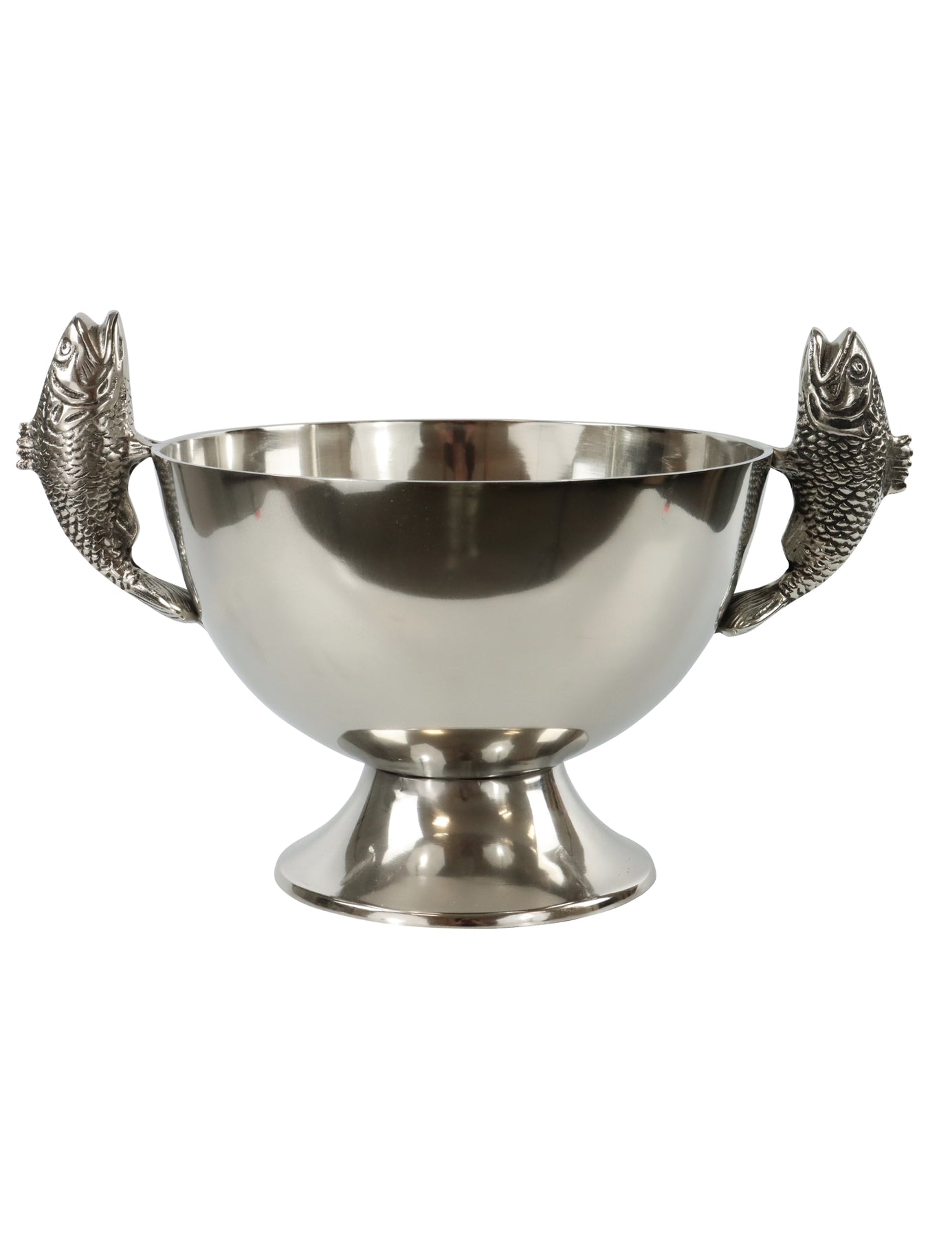 Dieser dekorative Pokal mit kunstvoll gearbeiteten Fischgriffen ist ein echter Blickfang und verleiht jedem Raum eine stilvolle und maritime Note. Die glänzende Oberfläche aus hochwertigem Aluminium sorgt für eine edle Ausstrahlung und reflektiert das Licht besonders schön. Durch seine imposante Größe eignet sich der Pokal ideal als Tischdekoration, für Sideboards oder als besonderes Highlight in Wohn und Essbereichen.