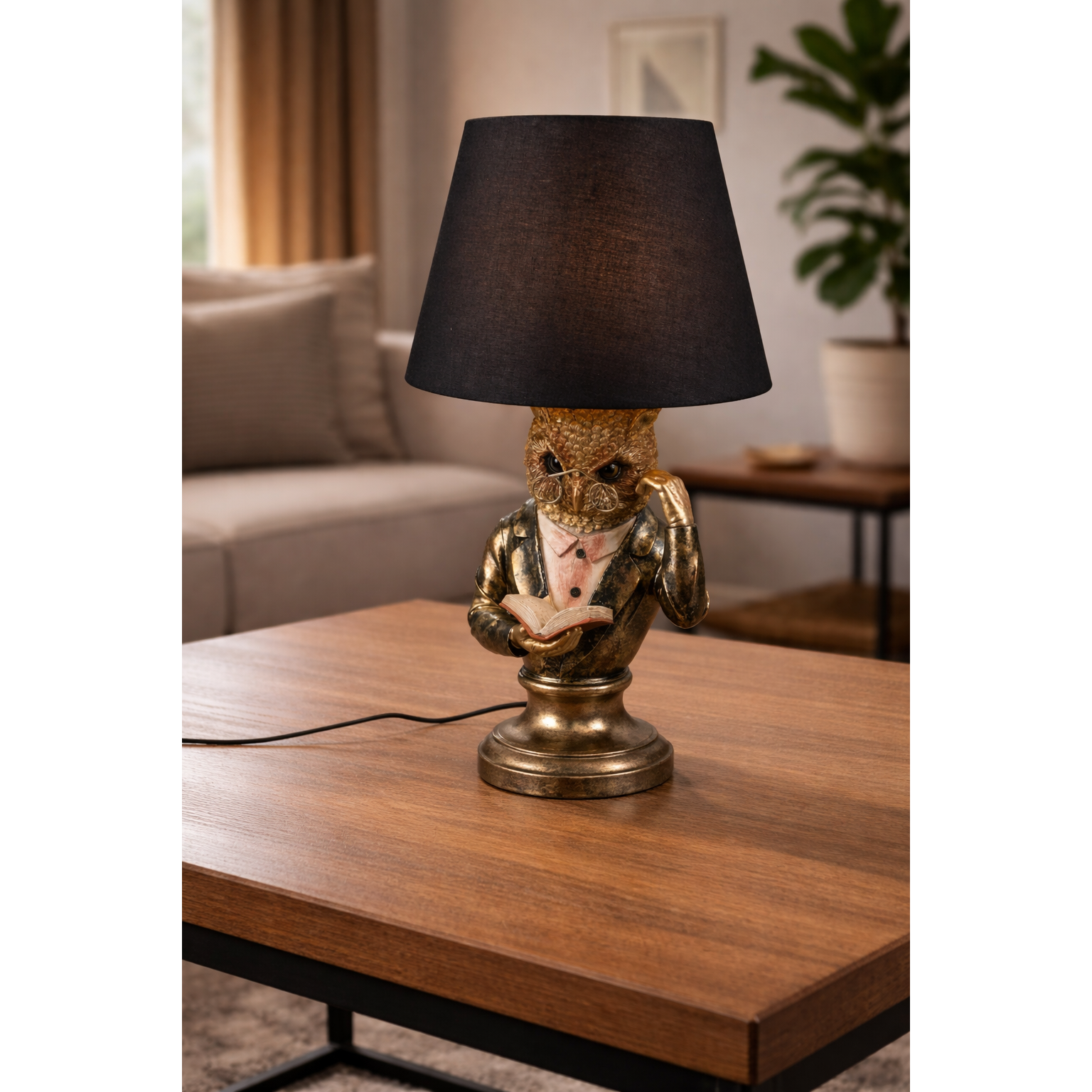 Design: dekorative Tischlampe „Eule Hedwig“ im Anzug mit Buch und Brille